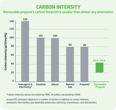 Renewable propane’s carbon intensity — or the carbon emitted for every unit of energy it produces — is lower than conventional propane because it’s produced from bio-based or renewable sources.